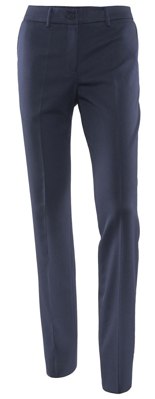 Pantalon femme. Ceinture 5 passants fermée par 1 bouton et 1 bouton intérieur. Braguette à glissière. Poches italiennes. Plis devant et dos marqués. Pinces dos. Bas de jambe non fini. E.J. : 90 cm.