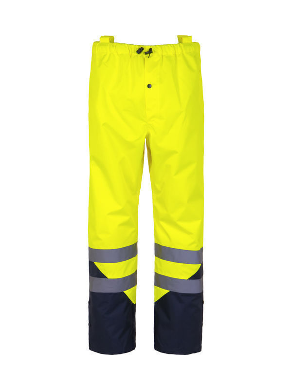 Pantalon haute visibilité. Ouverture braguette, fermée par bouton-pression. Ceinture élastiquée réglable par cordon de serrage et bloqueur. Passants au niveau de la ceinture avec auto-agrippant pour fixer les bretelles (en option). 2 passe-mains. Triangle d'aisance à l'entrejambe. Bas de jambes contrastés et fermés par 3 boutons-pression. 2 bandes rétroréfléchissantes en bas de jambe.