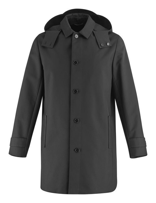 Trench homme. Découpes bretelles. Boutonnage apparent par 5 boutons. Capuche amovible par boutons. 2 poches devant dans les découpes avec rabat plaqué. Poche intérieure double passepoil boutonnée. Patte boutonnée en bas de manche. Fente de marche dos. Trench entièrement doublé avec plis d’aisance. Coupe regular. Longueur : 92 cm.
