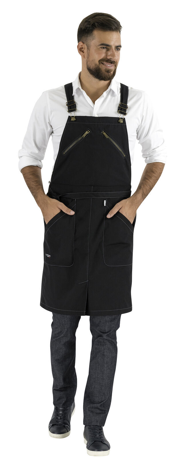 Tablier avec fente sur le milieu devant. Bretelles élastiquées amovibles, avec réglage sur le devant par boucle et au dos par boutons et boutonnière. Liens de serrage. Poches bavettes fermées par fermeture à glissière. Poches basses plaquées. Version en jean ou en lin et polyester recyclé.