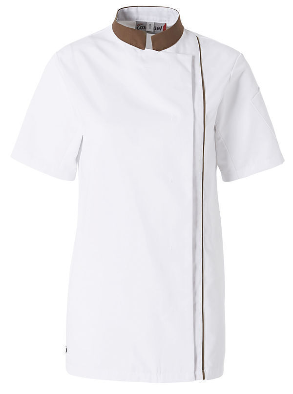 Veste femme avec col officier et liseré vertical contrastants. Découpe princesse au dos. Fermeture par 6 boutons-pression cachés. 1 poche stylo sur la manche gauche. Manches courtes, œillets d'aération sous les bras.