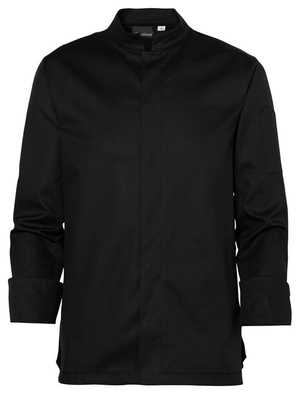 Veste homme avec col officier. Intérieur de col en maille renforcée par une triplure. Demi-lune en tissu encolure dos. Ouverture milieu devant par 6 pressions cachées. Découpes en maille piquée aux côtés terminées par 1 fente. Empiècement dos ergonomique en maille alvéolée. Manches longues, poignet mousquetaire. 1 poche crayon double compartiment plaquée sur manche gauche.