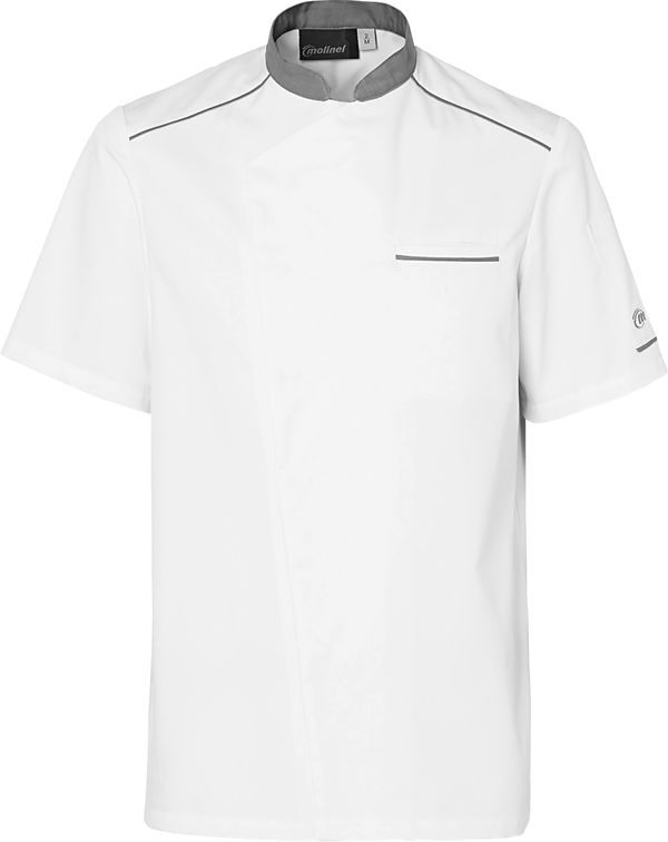 Veste homme col officier contrasté. Fermeture devant par 7 pressions cachées. 1 poche poitrine passepoilée. Empiècements épaules. Soufflet dos en maille respirante. Fentes côtés. Manches courtes. 1 poche stylo plaquée sur manche gauche. Empiècements sous bras en maille respirante. Passepoil contrastant : empiècements épaules devant et dos, bas de poche stylo, poche poitrine passepoilée.