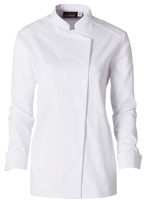Veste femme à col officier contrasté. Fermeture devant asymétrique par pressions cachées. Poche poitrine passepoilée. Manches longues, poignets rapportés. Poche stylo plaquée sur manche gauche. Fentes côtés. Empiècements sous bras et dos en maille respirante. Passepoil contrasté aux épaules devant et dos, bas de poche stylo. Coupe regular. Maille double face alvéolée antibactérienne.