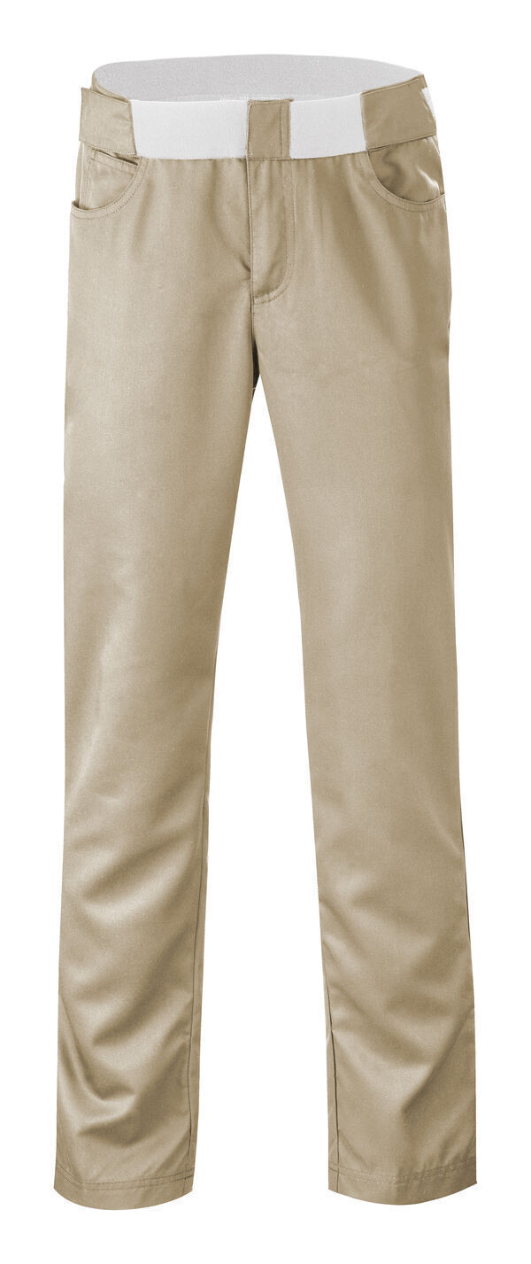 Pantalon mixte 5 poches. Ceinture avec élastique transfert d’humidité. Taille ajustable avec 2 pattes à élastique auto-agrippant à la ceinture. 2 poches cavalières avant avec poche ticket. 2 poches plaquées dos. Bas de jambe réglable sur 3 positions par système de pressions. E.J. : 82 cm.