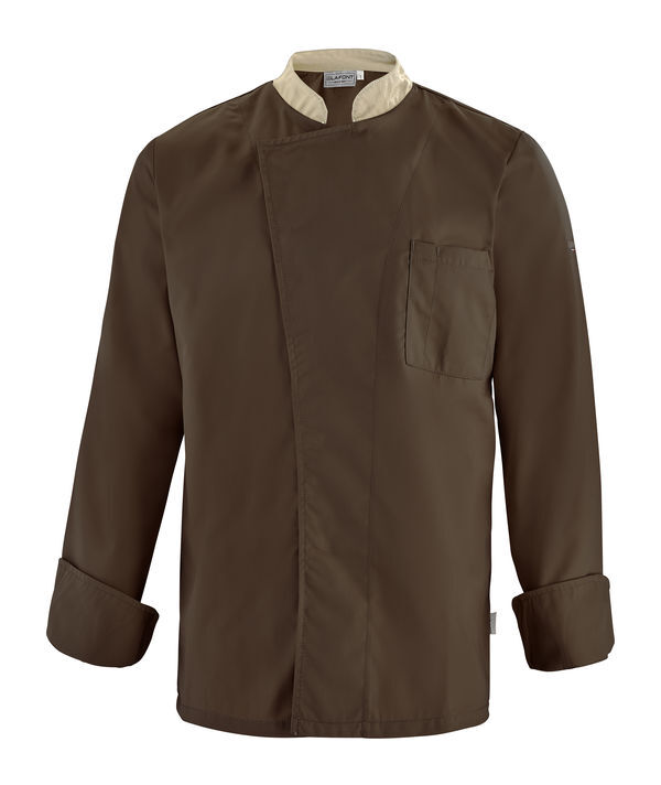 Veste de cuisine mixte à col officier. Fermeture asymétrique devant par boutons-pression cachés. Poche poitrine plaquée côté gauche avec compartiment stylo. Œillets d’aération. Manches longues. Poignets mousquetaires.