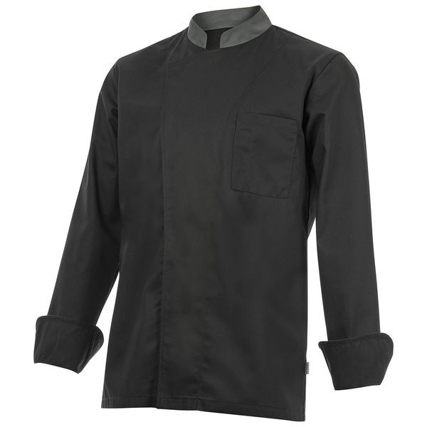 Veste de cuisine mixte à col officier. Fermeture asymétrique devant par boutons-pression cachés. Poche poitrine plaquée côté gauche avec compartiment stylo. Œillets d’aération. Manches longues. Poignets mousquetaires.