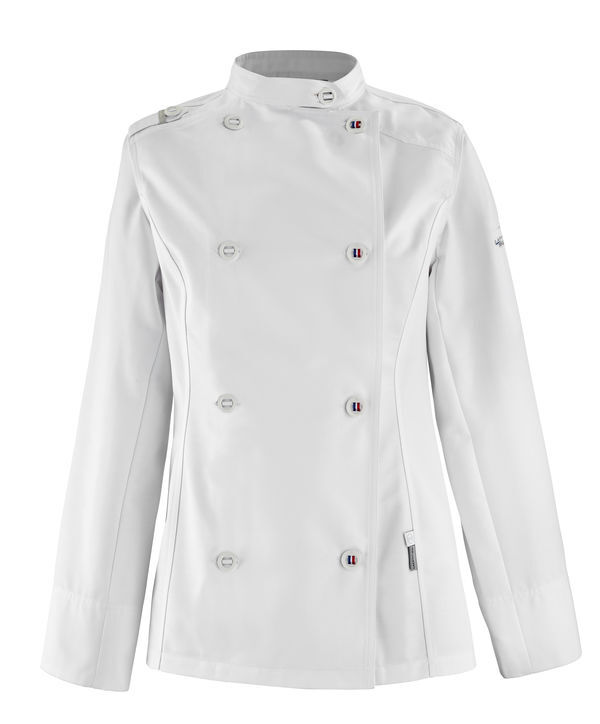 Veste femme d'inspiration "MILITAIRE" à col officier boutonné. Fermeture plastron réversible droite gauche par boutons, galon Bleu/Blanc/Rouge sur plastron devant gauche. Soufflet d’aisance milieu dos. Patte épaule gauche boutonnée avec passant contrasté amovible et personnalisable. Œillets brodés sous les bras. Poche stylo à double compartiment sur manche gauche. Poignets fendus. Matière thermorégulante 37.5®