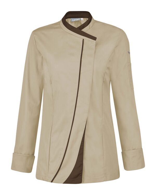 Veste femme à effet double col. Fermeture croisée par grippers cachés, double empiècement milieu dont angle bas contrasté et biais contrasté sur toute la hauteur. Découpes princesse sur devant et dos. Fentes côtés renforcées par un twill jacquard. OEillets d'aération brodés sous bras. Manches longues, poignets rapportés avec détails contrastés. Bas de manches à revers. Coupe ajustée.