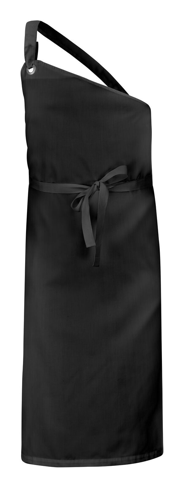 Tablier à bavette asymétrique avec bride d'épaule. Hauteur du tablier réglable par pression sur bride d'épaule. Lien de serrage en sangle coton, fermeture dos ou devant. Hauteur : 100 cm. Largeur : 97 cm.