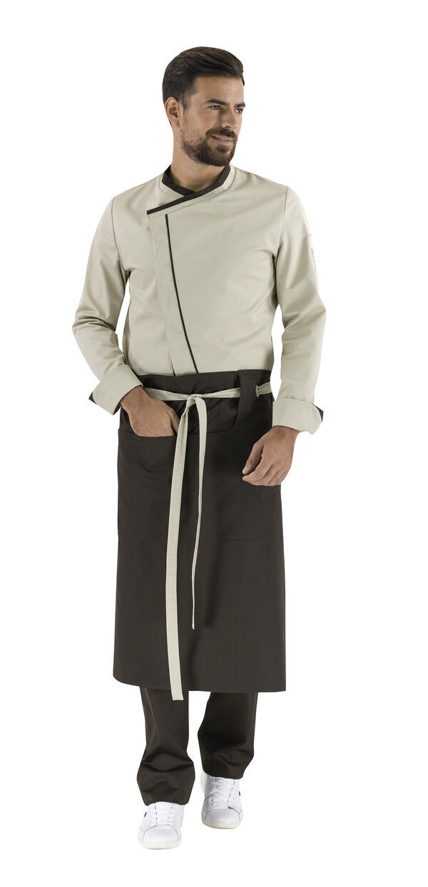 Tablier court avec poche compartimentée et liens contrastés. Hauteur totale : 100 cm. Largeur : 75 cm.