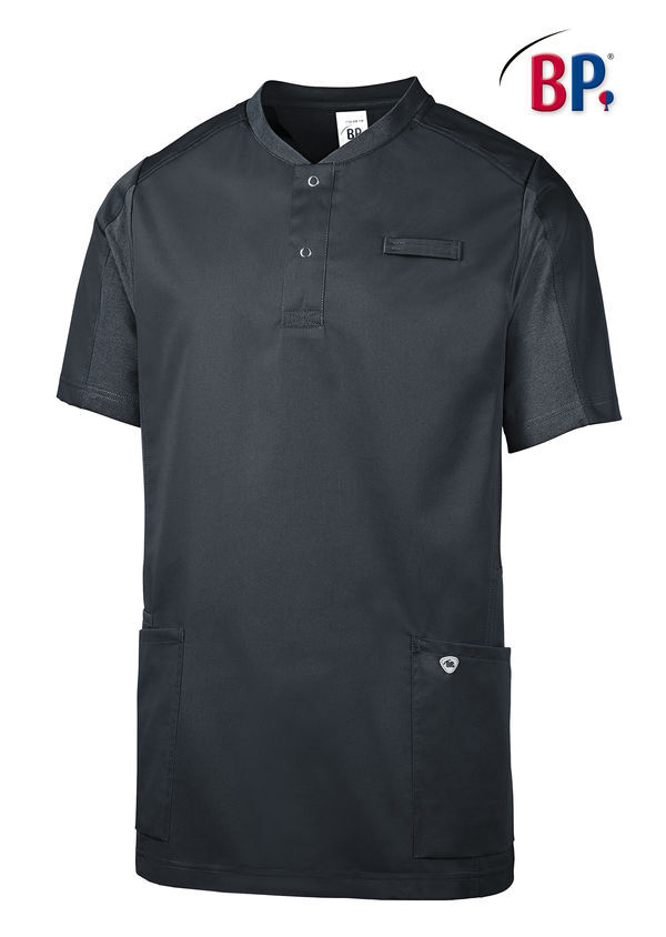 Tunique bi-matière à enfiler mixte. Encolure en V avec patte de boutonnage 2 boutons-pression. Empiècements en piqué extensibles sous les aisselles, 2 grandes poches latérales dont 1 avec poche pour bip, passant pour badge. Manches courtes. Longueur : 76 cm.