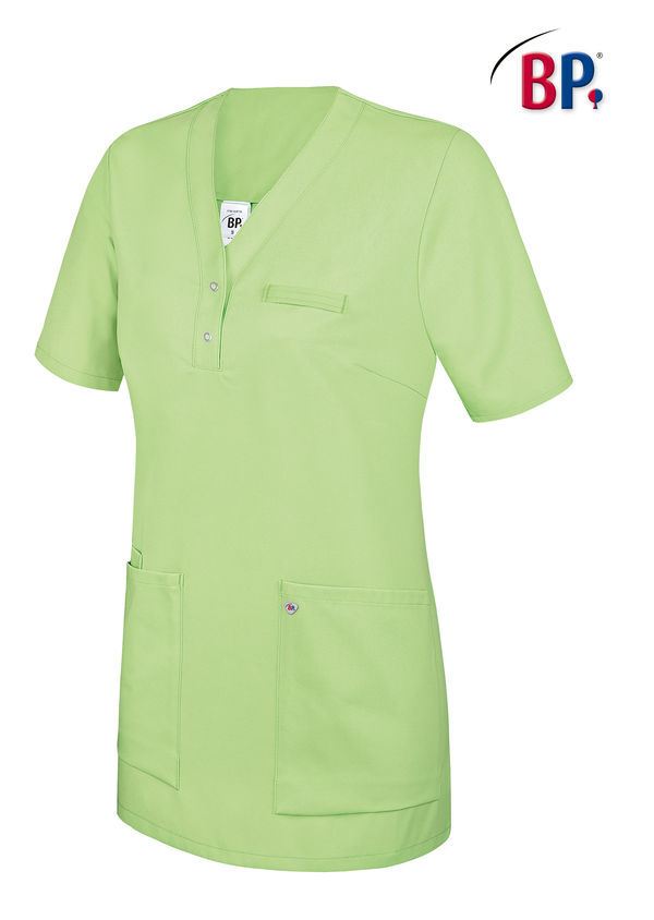 Tunique à enfiler coupe femme. Encolure en V avec patte à boutons-pression étroite. Empiècements extensibles sous les aisselles. Pinces poitrine. 2 grandes poches latérales dont 1 avec poche pour bip, passant pour badge. Coupe ajustée. Manches courtes. Longueur : 75 cm.
