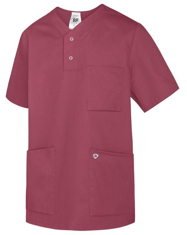 Tunique à enfiler mixte. Encolure en V avec patte à boutons-pression étroite. Empiècements extensibles sous les aisselles. 2 grandes poches latérales. Manches courtes. Longueur : 75 cm.
