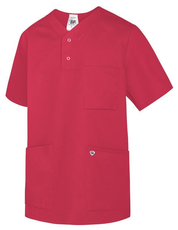 Tunique à enfiler mixte. Encolure en V avec patte à boutons-pression étroite. Empiècements extensibles sous les aisselles. 2 grandes poches latérales. Manches courtes. Longueur : 75 cm.