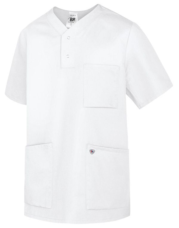 Tunique à enfiler mixte. Encolure en V avec patte à boutons-pression étroite. Empiècements extensibles sous les aisselles. 2 grandes poches latérales. Manches courtes. Longueur : 75 cm.