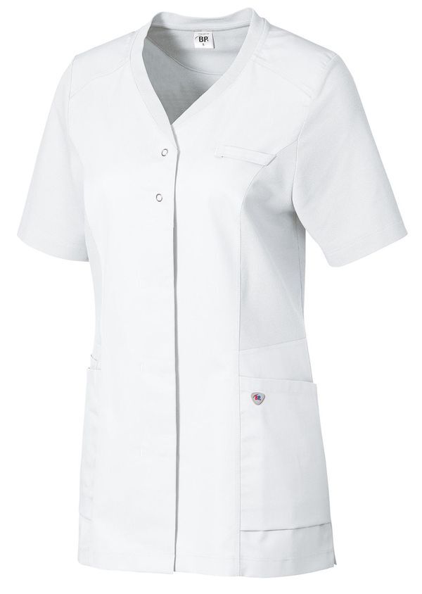 Tunique bi-matière coupe femme. Encolure en V. Fermeture par patte à boutons-pression dissimulée, dont 2 boutons-pression visibles. Empiècements en piqué, 2 grandes poches latérales dont 1 avec poche pour bip, passant pour badge. Manches courtes. Longueur : 68 cm.