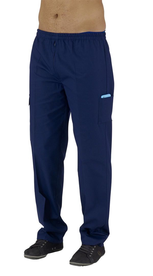 Pantalon homme. Ceinture élastiquée, braguette zip. 1 poche BIP cuisse gauche, 1 poche à soufflet avec rabat cuisse droite. E.J. : 82 cm.