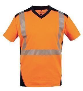 T-shirt haute visibilité. Col V contrasté. Manches courtes. Empiècement maille ajourée contrastée sous les bras. | Bandes rétroréfléchissantes segmentées microbilles thermocollées. Maille polyester transfert d’humidité et anti UV UPF 40+. Coupe cintrée.
