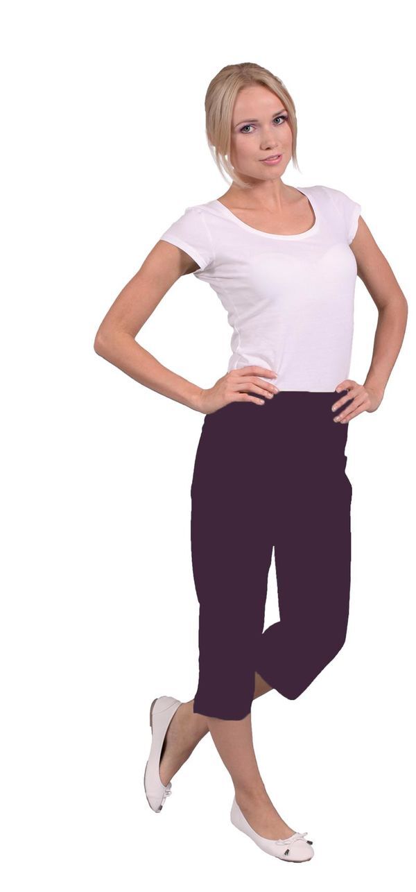 Pantacourt femme. Taille semi-élastiquée effet ventre plat. Sans poche. Fentes latérales bas de jambe. E.J. : 52 cm.