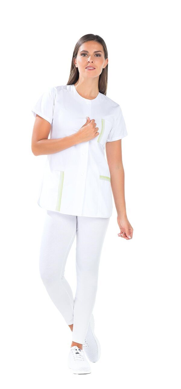 Tunique femme. Fermeture milieu devant par boutons-pression. 2 poches basses. Poche poitrine avec ruban décoratif. Manches courtes kimono. Bas forme liquette. Fentes côtés. Longueur : 75 cm.