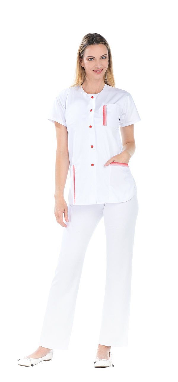 Tunique femme. Fermeture milieu devant par boutons-pression 2 poches basses. Poche poitrine avec ruban décoratif. Manches courtes kimono. Bas forme liquette. Fentes côtés. Longueur : 75 cm.