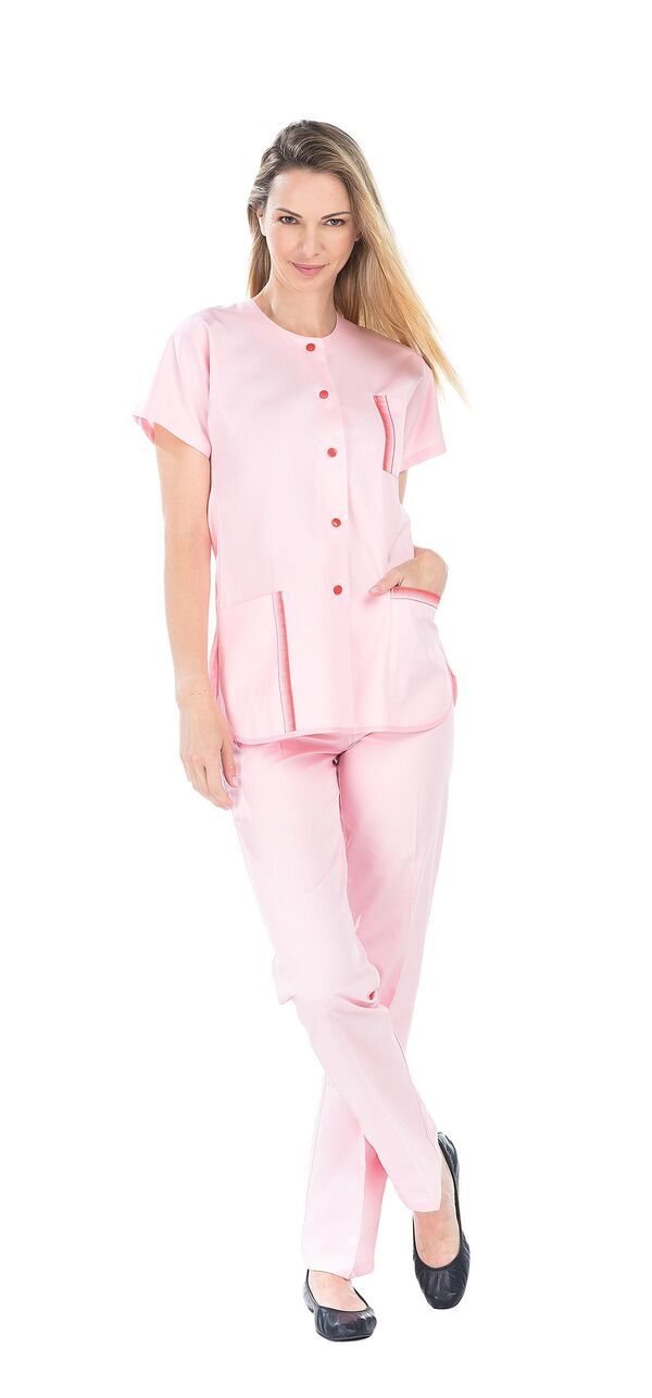 Tunique femme. Fermeture milieu devant par boutons-pression. 2 poches basses. Poche poitrine avec ruban décoratif. Manches courtes kimono. Bas forme liquette. Fentes côtés. Longueur : 75 cm.