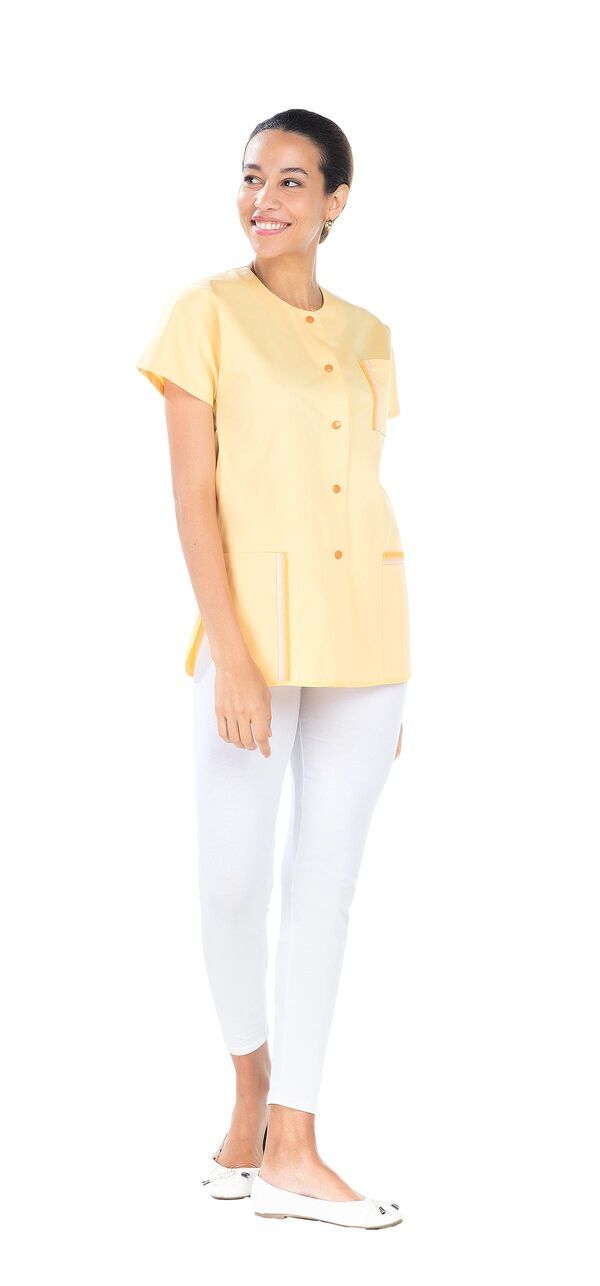 Tunique femme. Fermeture milieu devant par boutons-pression. 2 poches basses. Poche poitrine avec ruban décoratif. Manches courtes kimono. Bas forme liquette. Fentes côtés. Longueur : 75 cm.