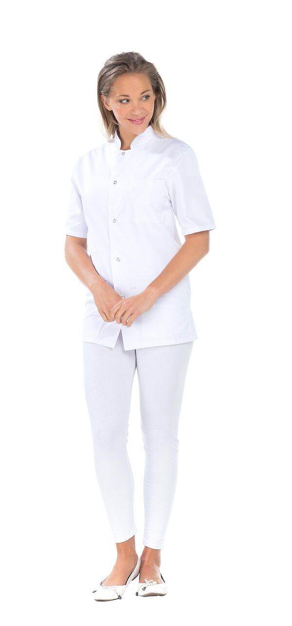 Tunique mixte. Col mao. Fermeture milieu devant par boutons-pression. 2 poches basses. Poche poitrine. Manches courtes. Fentes côtés. Longueur : 75 cm.