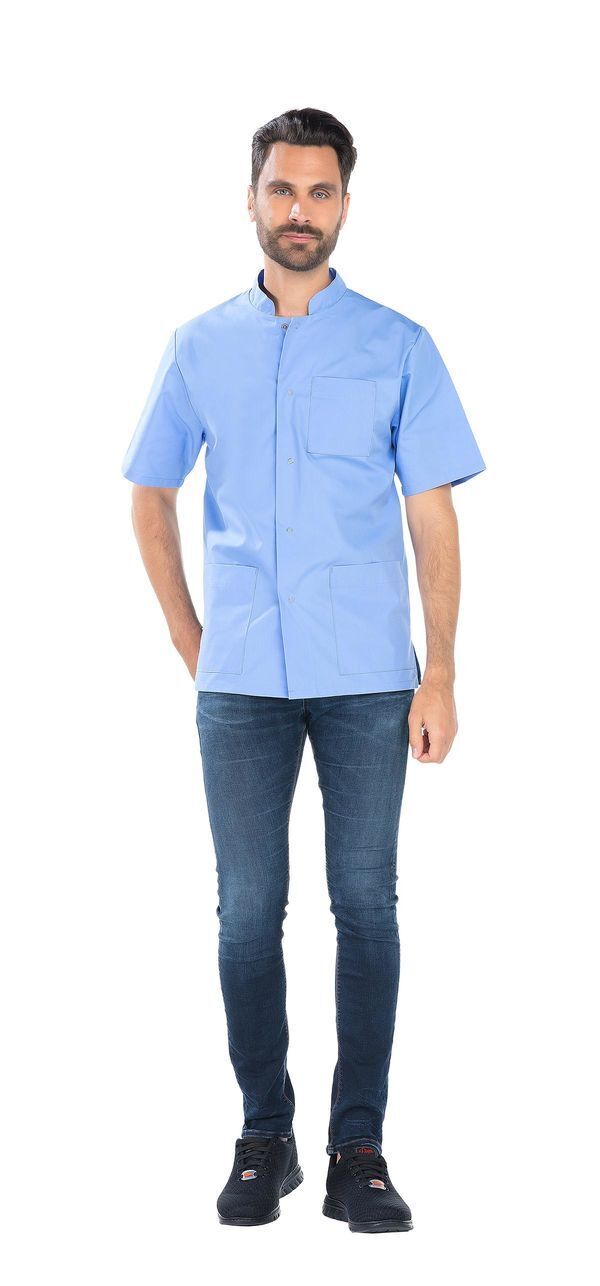 Tunique mixte. Fermeture milieu devant par boutons-pression. 2 poches basses. Poche poitrine. Manches courtes. Fentes côtés. Longueur : 75 cm.