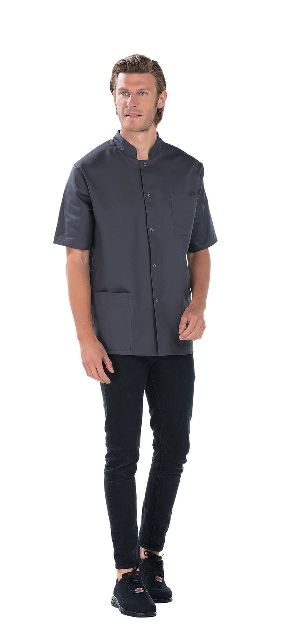 Tunique mixte. Fermeture milieu devant par boutons-pression. 2 poches basses. Poche poitrine. Manches courtes. Fentes côtés. Longueur : 75 cm.