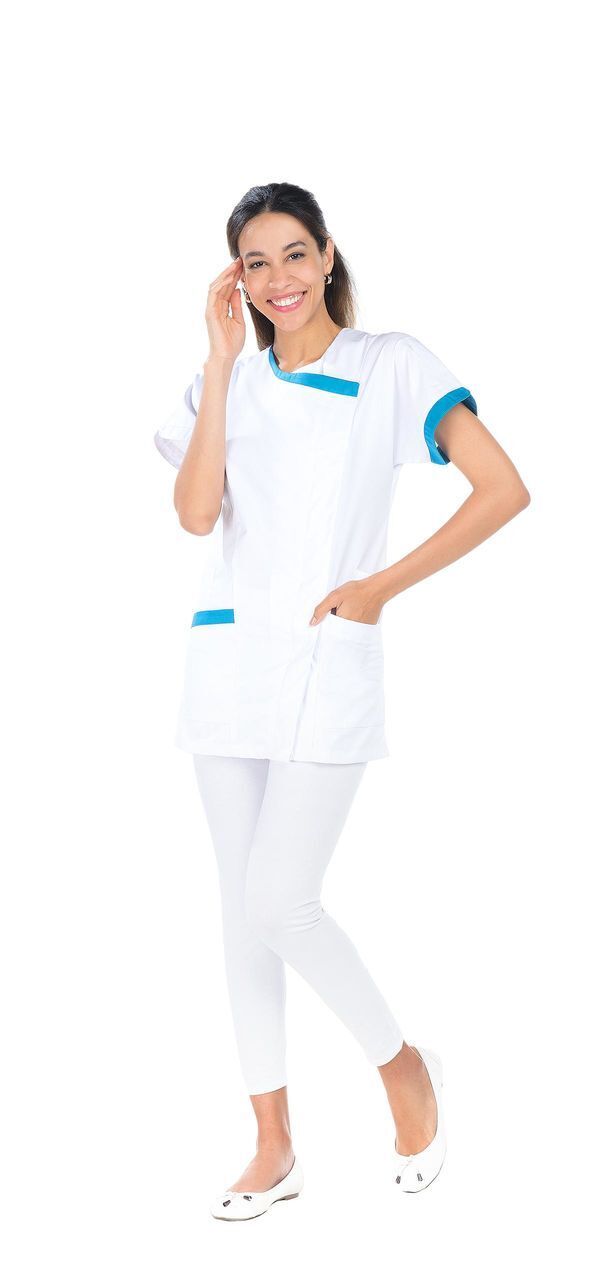Tunique femme. Fermeture asymétrique par pressions sous patte. 2 poches basses. 2 poches BIP. Poche stylo sur manche gauche. Manches courtes kimono. Fentes côtés. Détails contrastés. Longueur : 75 cm.