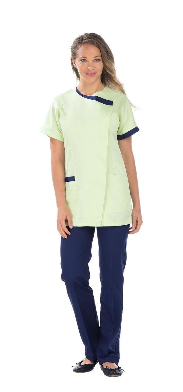 Tunique femme. Fermeture asymétrique par pressions sous patte. 2 poches basses. 2 poches BIP. Poche stylo sur manche gauche. Manches courtes kimono. Fentes côtés. Détails contrastés. Longueur : 75 cm.