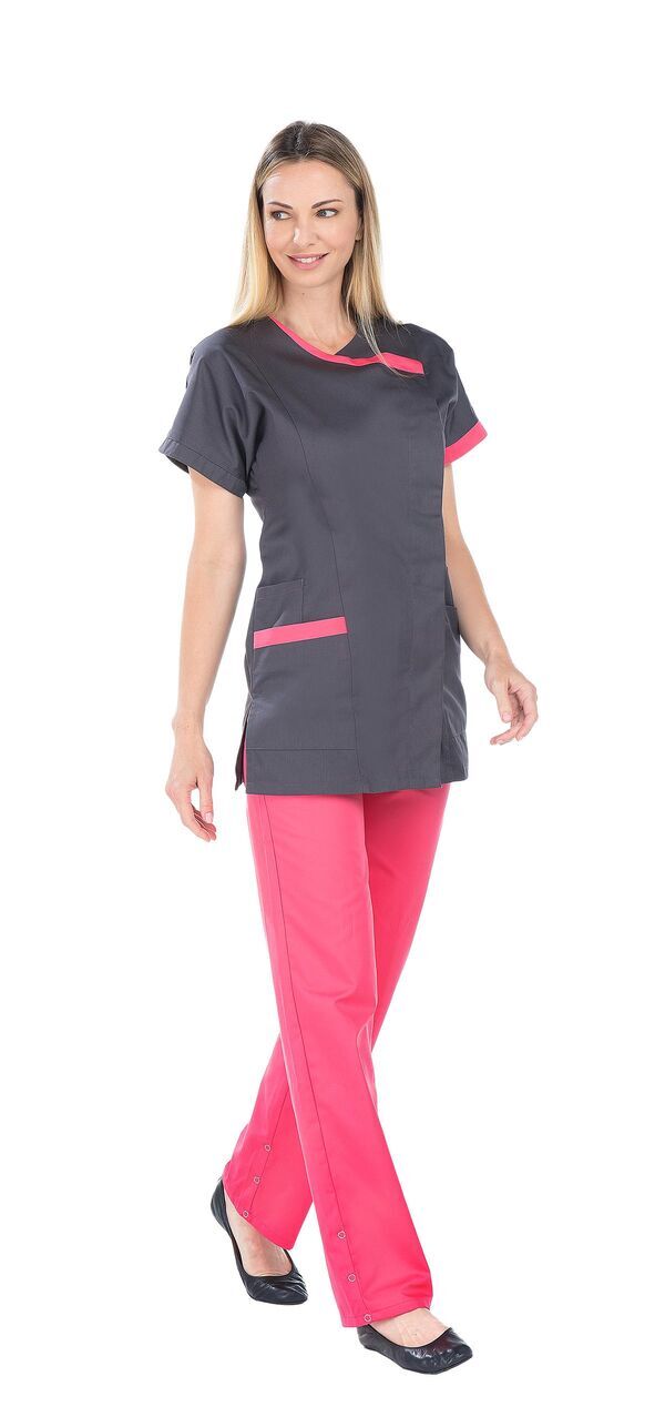 Tunique femme. Fermeture asymétrique par pressions sous patte. 2 poches basses. 2 poches BIP. Poche stylo sur manche gauche. Manches courtes kimono. Fentes côtés. Détails contrastés. Longueur : 75 cm.