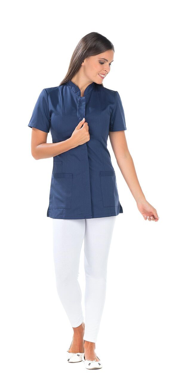 Tunique femme. Fermeture milieu devant par boutons-pression sous patte. 2 poches basses. Poche BIP. Manches courtes. Fentes côtés. Longueur : 75 cm.