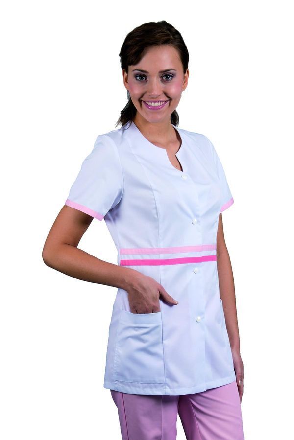 Tunique coupe femme. Encolure fantaisie. Fermeture centrale par pressions ton sur ton. 2 poches basses plaquées. 2 bandes contrastées à la taille. Sans manches. Longueur : 75 cm.