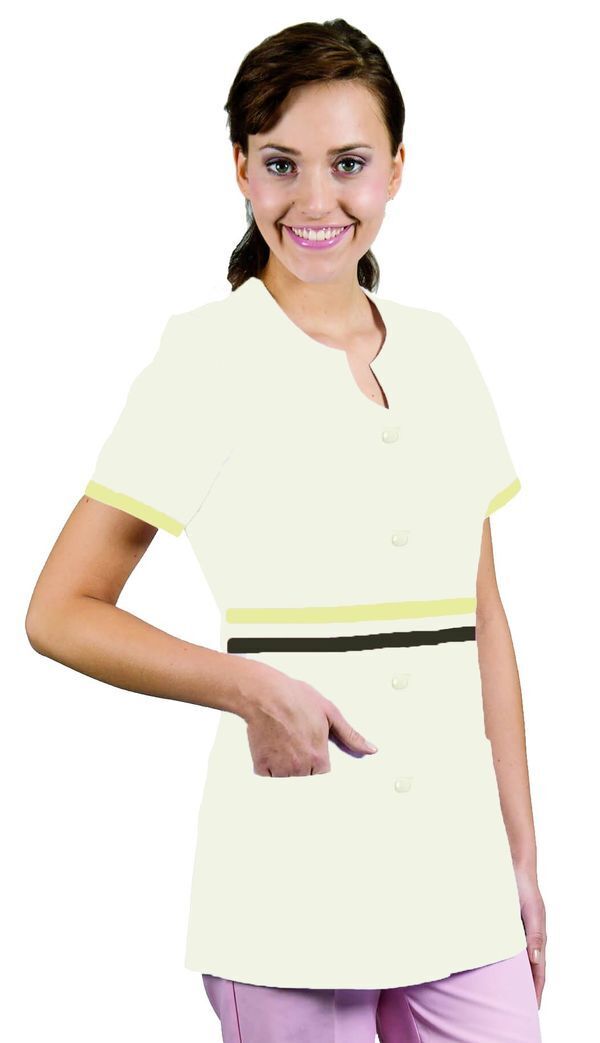 Tunique coupe femme. Encolure fantaisie. Fermeture centrale par pressions ton sur ton. 2 poches basses plaquées. 2 bandes contrastées à la taille. Sans manches. Longueur : 75 cm.