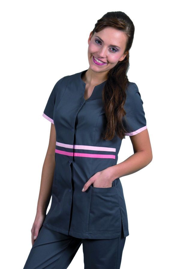 Tunique coupe femme. Encolure fantaisie. Fermeture centrale par pressions ton sur ton. 2 poches basses plaquées. 2 bandes contrastées à la taille. Sans manches. Longueur : 75 cm.