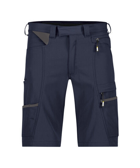 Bermuda full stretch. Ceinture avec passants, serrage élastique dos réglable. Fermeture centrale par crochet cachée avec pression. Braguette zippée. 2 poches italienne. Poche cuisse de sécurité à rabat fermée par zip. Porte-crayon. Poche cutter. Poche téléphone. Boucle porte badge. Anneau en D. 2 poches dos plaquée dont poche droite avec rabat. | Coupe slim fit. E.J. : 28 cm.