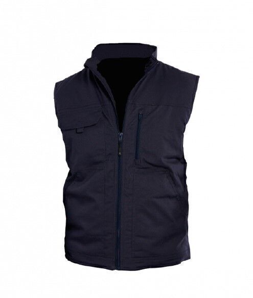 Bodywarmer doublé polaire. Col officier. Ouverture milieu devant par zip avec protège-menton. Une poche poitrine zippée et une à rabat côté gauche. 2 poches basses. Dos couvre-reins. | Sans partie métallique