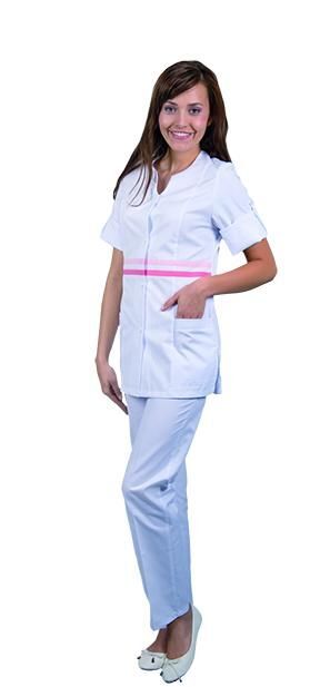 Tunique coupe femme. Encolure fantaisie. Fermeture centrale par pressions ton sur ton. 2 poches basses plaquées. 2 bandes contrastées à la taille. Sans manches. Longueur : 75 cm.