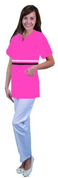 Tunique coupe femme. Encolure fantaisie. Fermeture centrale par pressions ton sur ton. 2 poches basses plaquées. 2 bandes contrastées à la taille. Sans manches. Longueur : 75 cm.