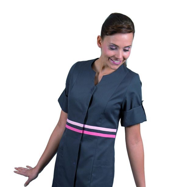 Tunique coupe femme. Encolure fantaisie. Fermeture centrale par pressions ton sur ton. 2 poches basses plaquées. 2 bandes contrastées à la taille. Sans manches. Longueur : 75 cm.