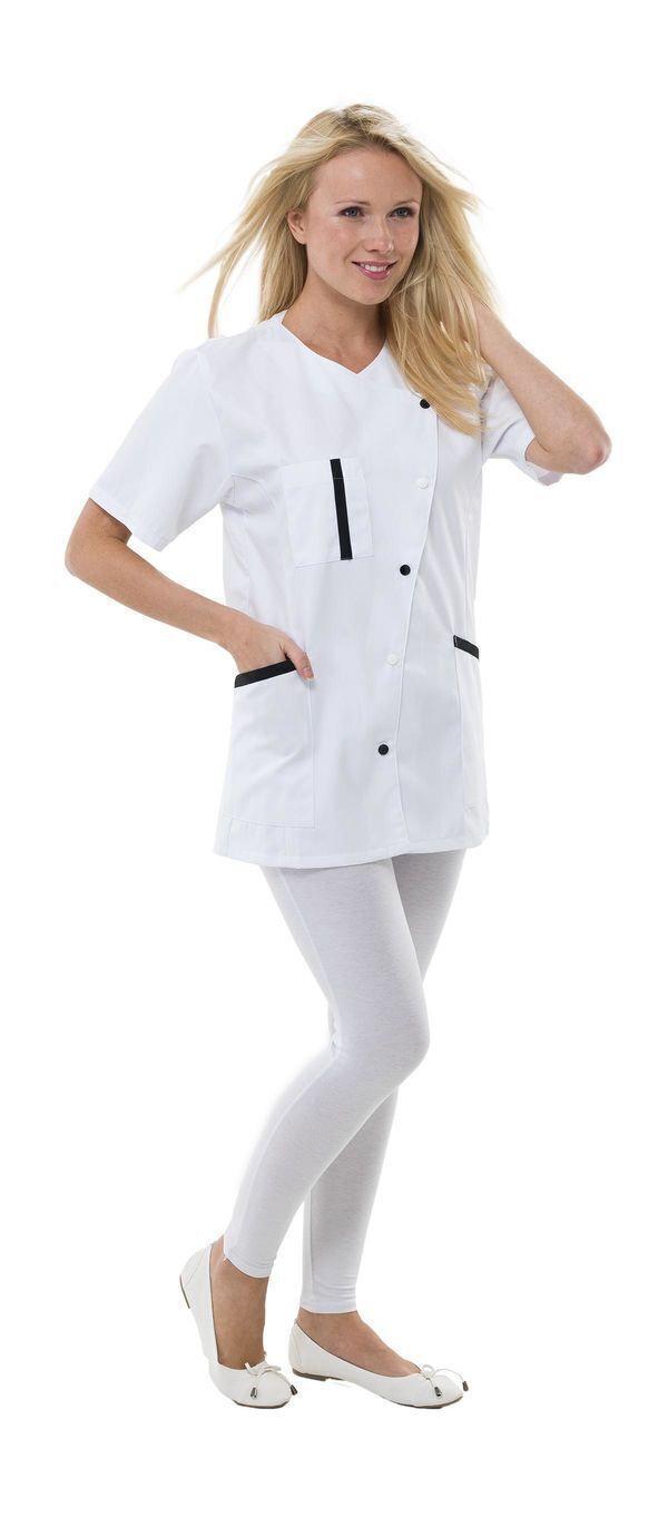 Tunique femme. Encolure V. Fermeture asymétrique par boutons-pression contrastées. Poche poitrine avec compartiment stylo, 2 poches basses. Manches courtes. Longueur : 75 cm.