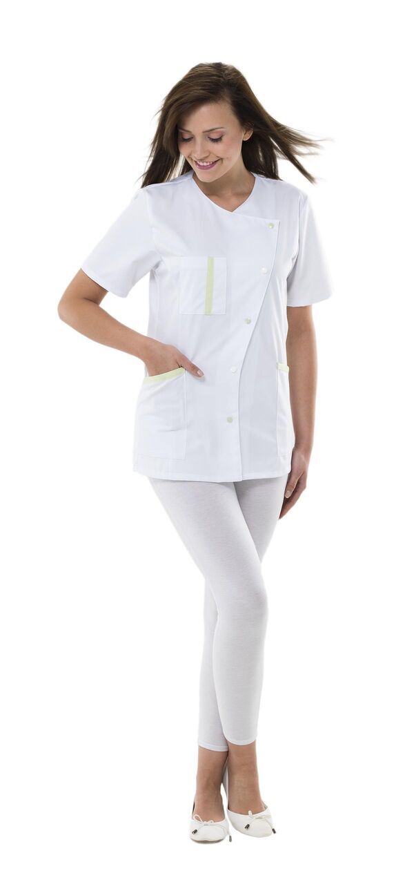 Tunique femme. Encolure V. Fermeture asymétrique par boutons-pression contrastées. Poche poitrine avec compartiment stylo, 2 poches basses. Manches courtes. Longueur : 75 cm.