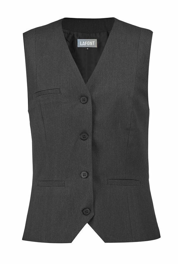 Gilet femme. Fermeture milieu devant par boutons. Poche poitrine insérée côté droit, 2 poches basses passepoilées.