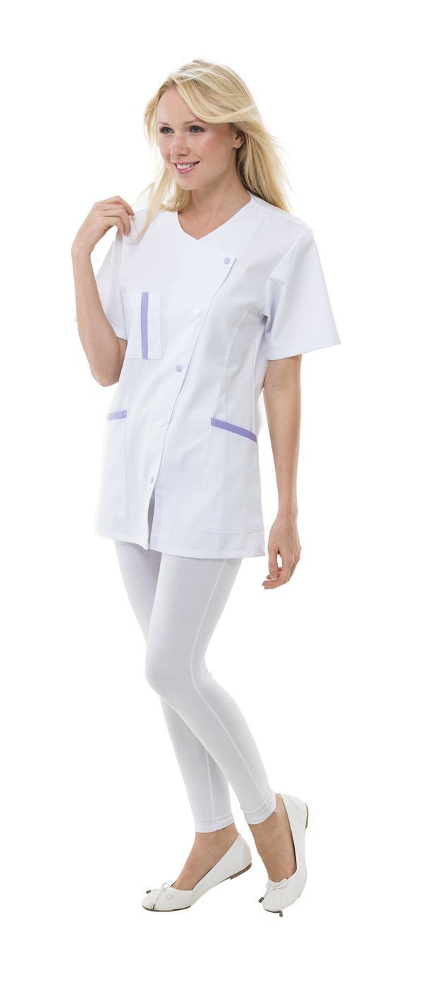Tunique femme. Encolure V. Fermeture asymétrique par boutons-pression contrastées. Poche poitrine avec compartiment stylo, 2 poches basses. Manches courtes. Longueur : 75 cm.
