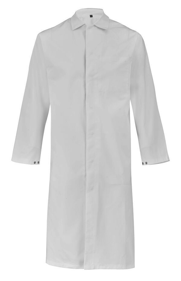 Blouse de travail homme à col chemise avec collerette de marquage. Fermeture milieu devant par boutons-pression cachés. Poche poitrine. Poche curée côté droit. Manches longues semi-raglan, bas de manches réglables par boutons-pression. Poche poitrine intérieur. Longueur : 115 cm.