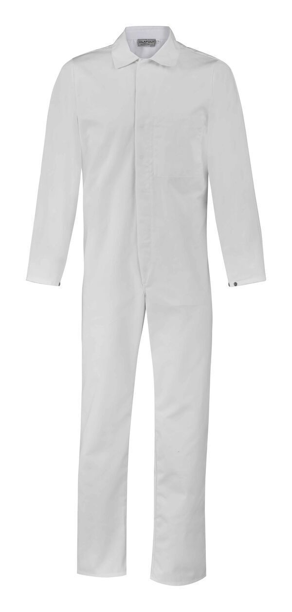 Combinaison à col chemisier avec collerette de marquage. Fermeture milieu devant par boutons-pression cachés. Poche poitrine, 2 poches côtés dont poche curée côté droit et passe-main avec bouton-pression côté gauche. Pattes de serrage côté dos par boutons-pression. Manches longues semi-raglan et bas de manches réglables par boutons-pression. Poche intérieure fermée par auto-agrippant. E.J. : 85 cm.