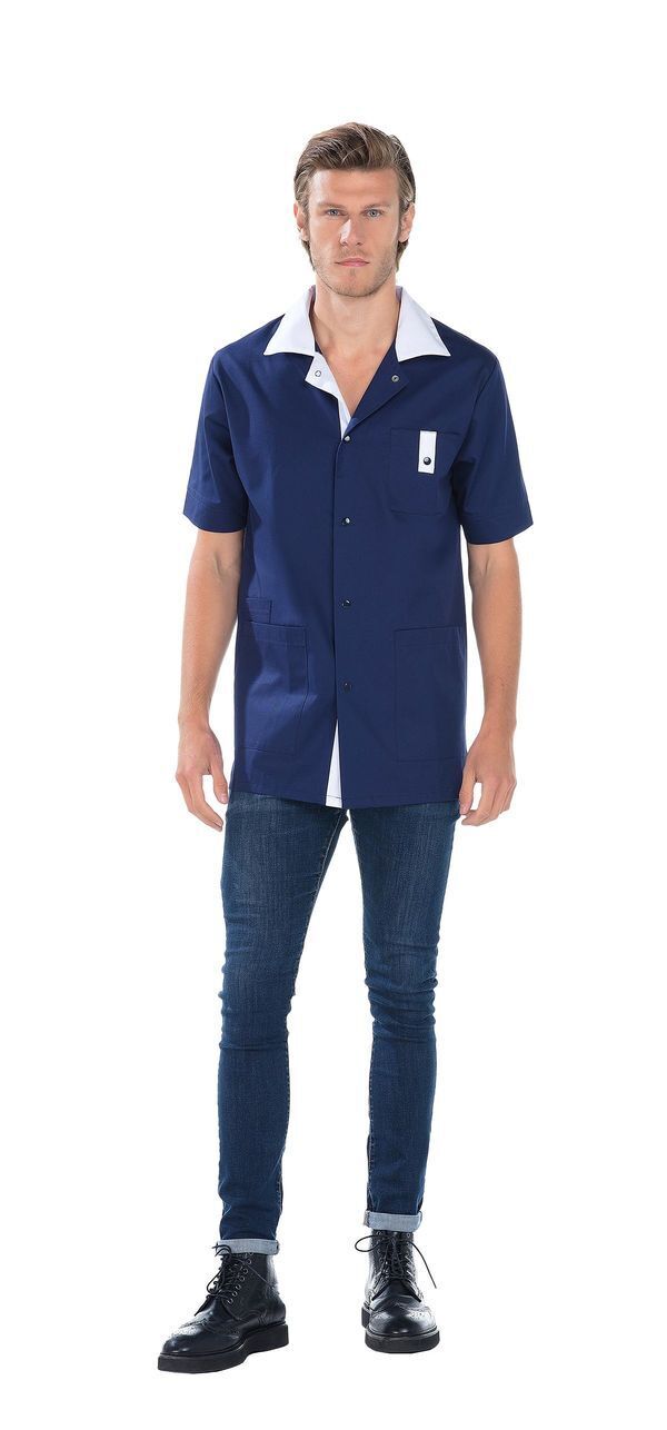 Tunique mixte. Fermeture milieu devant par boutons-pression. 2 poches basses. Poche BIP. Poche poitrine. Manches courtes. Fentes côtés. Longueur : 75 cm.